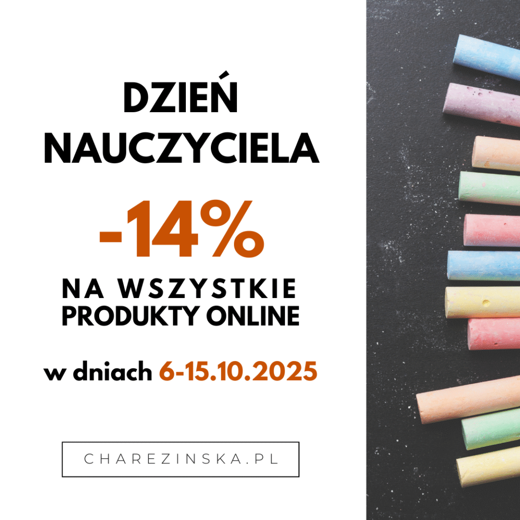 Z okazji Dnia Nauczyciela mam dla Państwa coroczną zniżkę w wysokości 14% na wszystkie moje produkty online. Wystarczy, że w dniach 6-15.10. 2025 wpiszecie Państwo hasło DZIEŃ NAUCZYCIELA podczas składania zamówienia w sklepie online, a cena w koszyku obniży się o 14%.